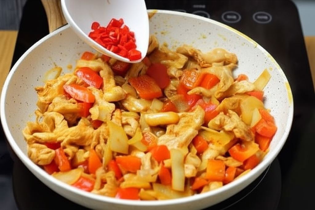 Całość smaż na nagrzanej patelni ok.10 min. Na końcu dodaj papryczkę chili i smaż jeszcze moment razem.