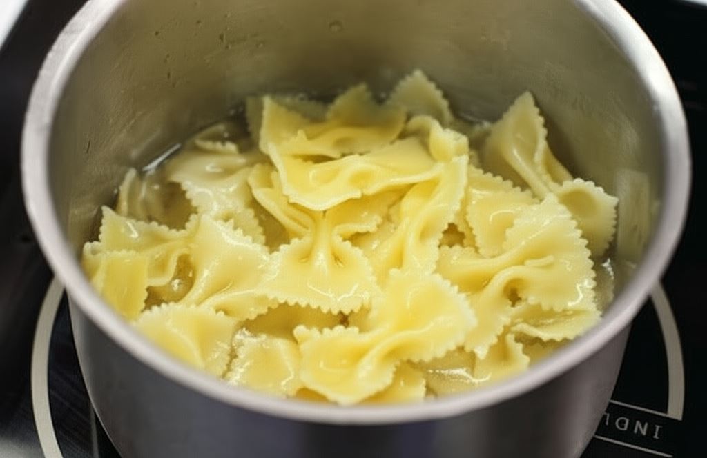 Makaron ugotuj w delikatnie posolonym wrzątku. Potem odcedź go, zachowując wodę z gotowania.