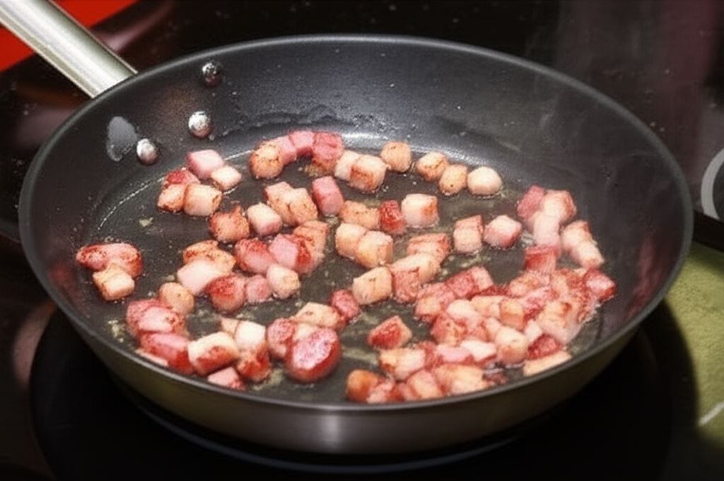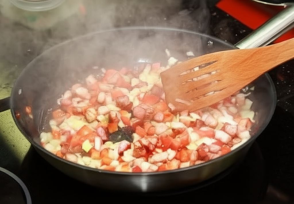 Przyrumień boczek na patelni (jeśli wytopił się sporo tłuszczu, część możesz odlać), wsyp po kolei cebulę i paprykę. Dodaj też koncentrat pomidorowy i jeszcze moment przyrumień.