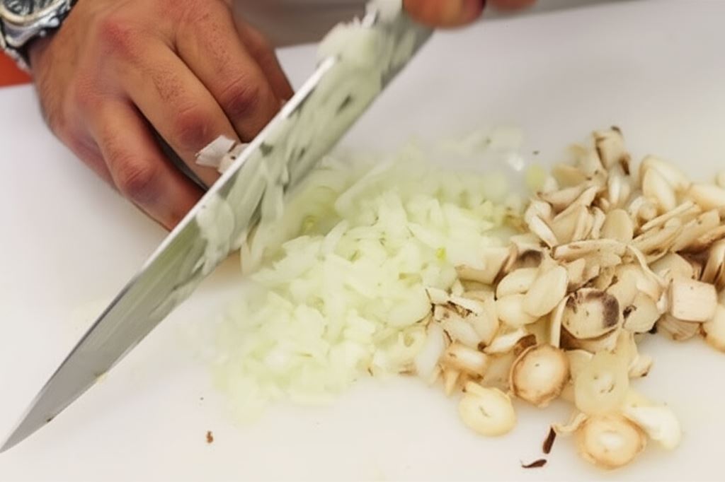 Oczyść pieczarki, oddziel nóżki, a potem posiekaj je. Posiekaj też cebulę.