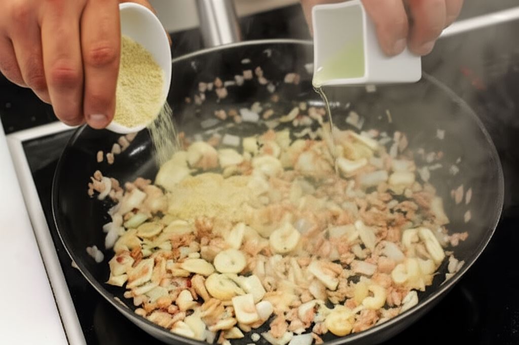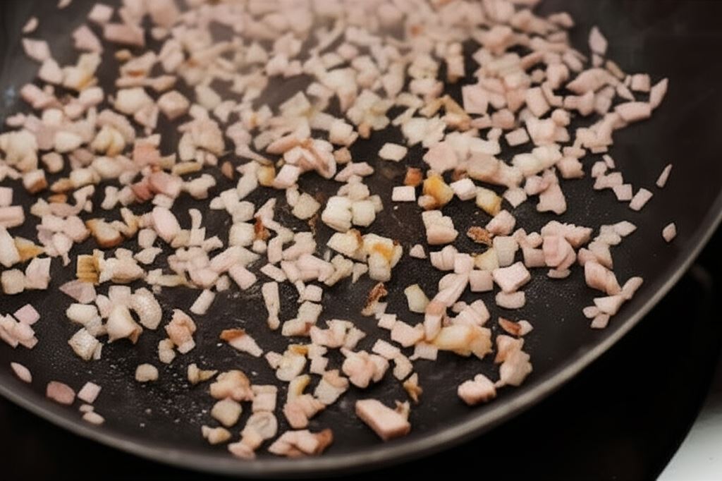 Posiekaj boczek i szynkę w małą kostkę, następnie podsmaż je na oleju.