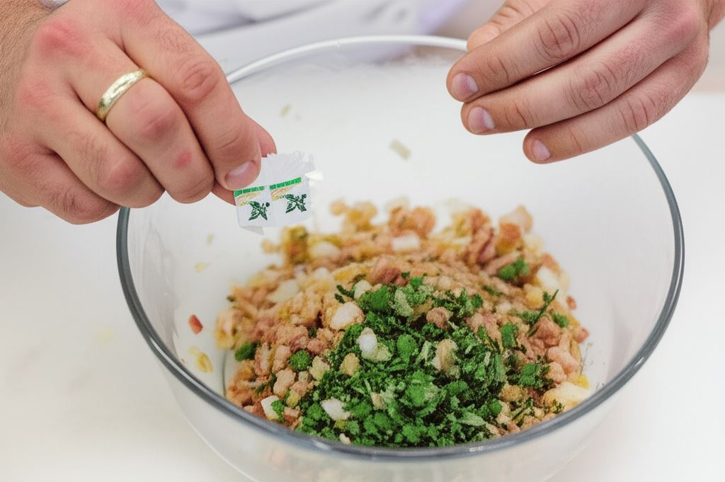 Posiekaj pietruszkę i czosnek, następnie dodaj do farszu, a całość przypraw pokruszoną przyprawą w mini kostkach Knorr i tymiankiem.