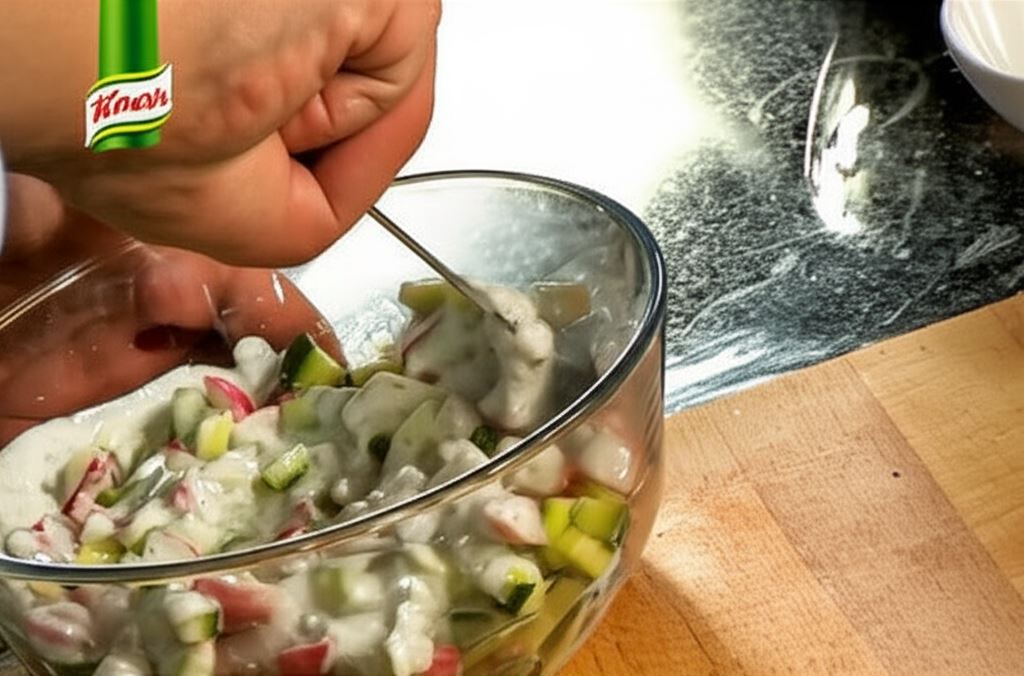 Przygotuj sałatkę: ogórka i rzodkiewkę opłucz i posiekaj w małą kostkę. Orzechy rozdrobnij i wsyp do warzyw. Wszystko polej sosem sałatkowym, a następnie starannie wymieszaj.