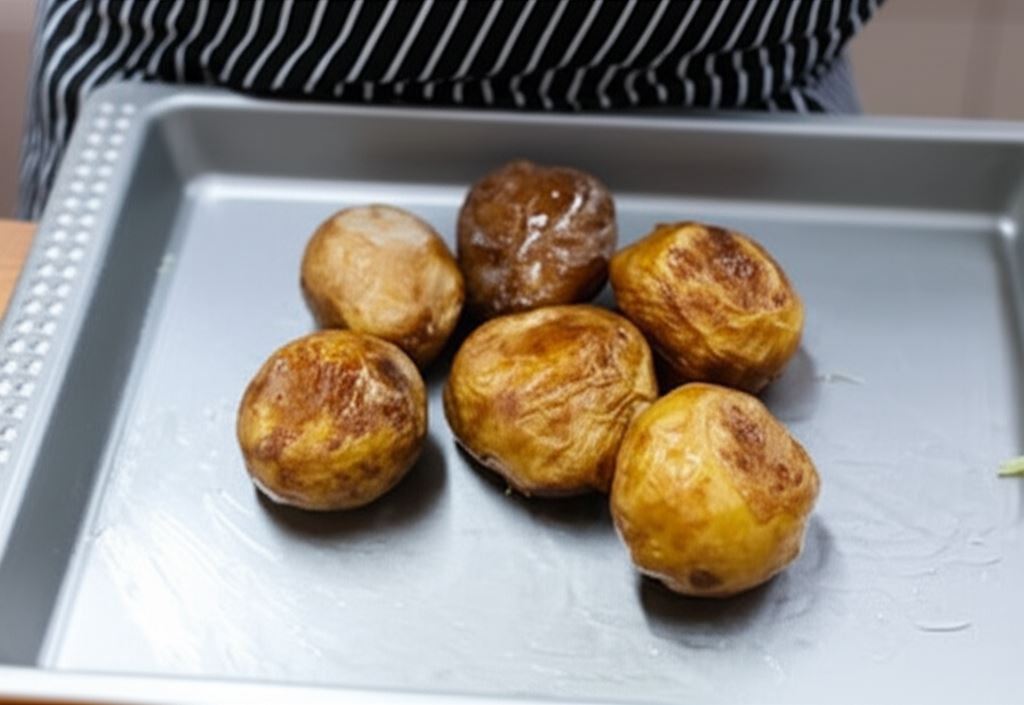Ziemniaki opłucz, wysusz, posmaruj na powierzchni olejem i umieść w piekarniku rozgrzanym do 190*C na około 45 minut, aby były miękkie wewnątrz. Następnie odłóż je na bok do ostygnięcia.