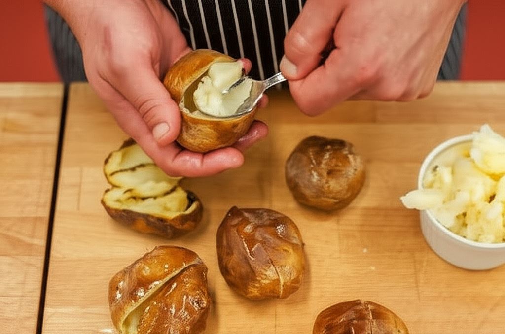 Ziemniaki sałatkowe najlepiej nadają się do faszerowania dzięki zwartemu miąższowi, który nie kruszy się podczas wydrążania. Aby skrócić czas przygotowania, możesz je wcześniej podgotować. Majonez w farszu nie tylko łączy składniki, ale nadaje im kremowej konsystencji i wyrazistego smaku.