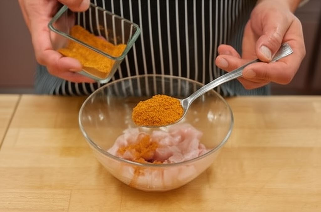Pierś kurczaka pokrój w kostkę, połącz z olejem i przyprawą. Kurczaka podsmaż na nagrzanej patelni. Odstaw na bok do ostygnięcia. Kukurydzę z puszki odcedź, odłóż na bok.