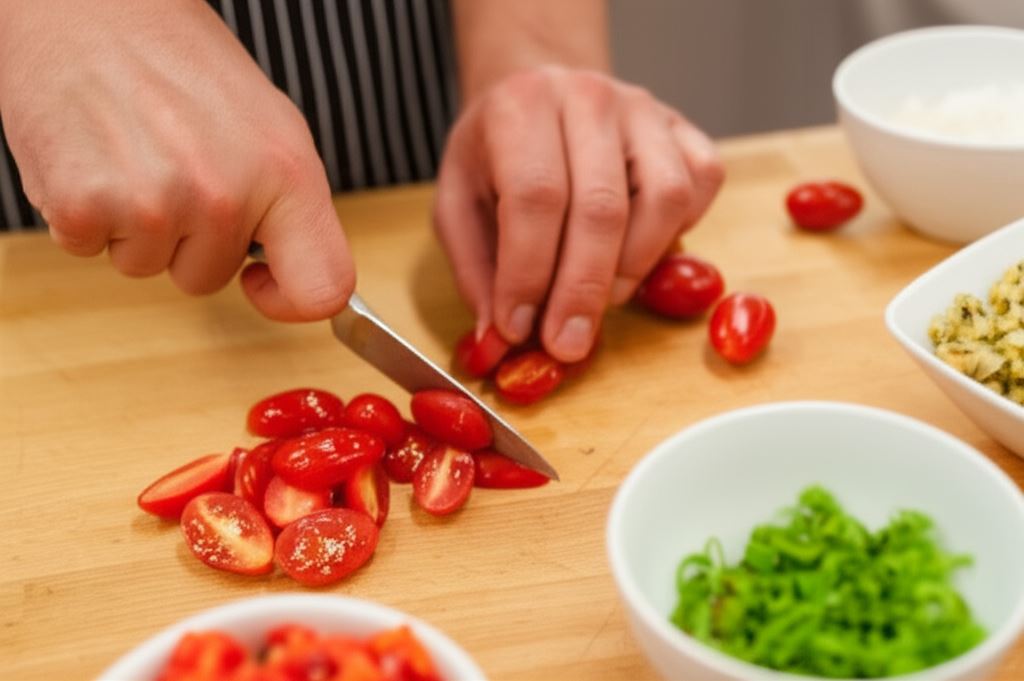 Odetnij szczypior z dymki i posiekaj go drobno. Cebulkę dymkę, paprykę oraz ogórki pokrój w małą kosteczkę. Posiekaj kolendrę, pomidorki przekrój na połówki.