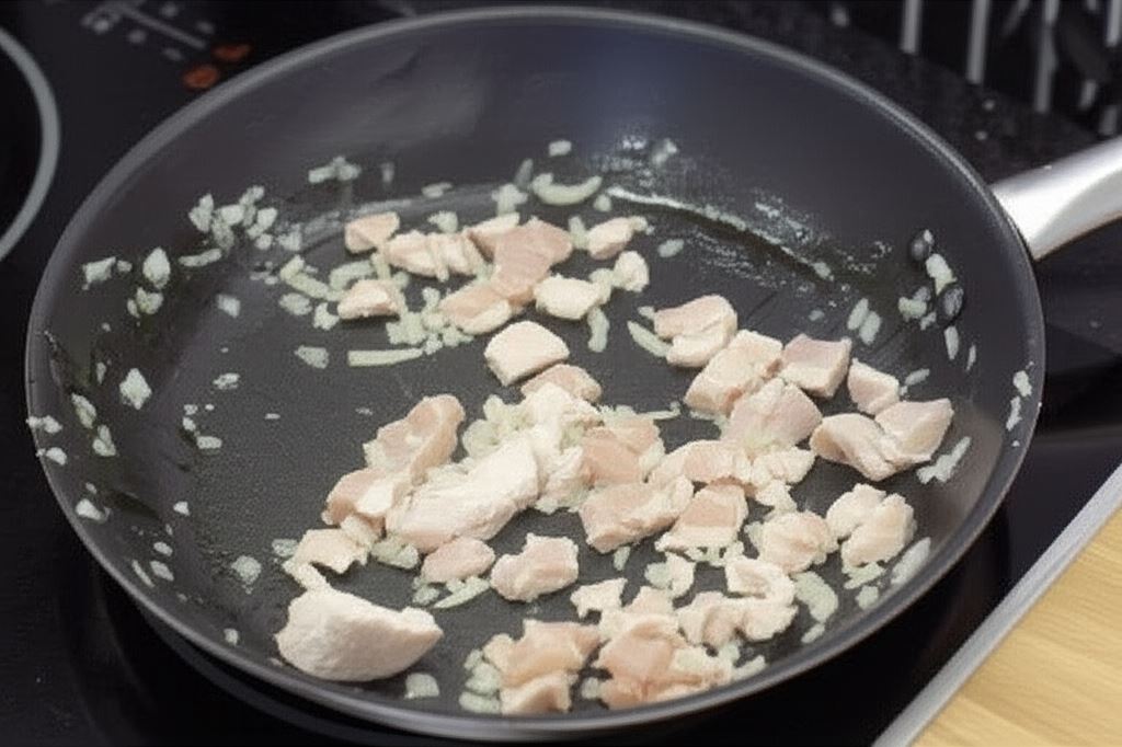 Posiekaj cebulę i czosnek. Kurczaka pokrój na drobne kawałki i przesmaż razem na patelni. Przypraw mięso przyprawą do złotego kurczaka.