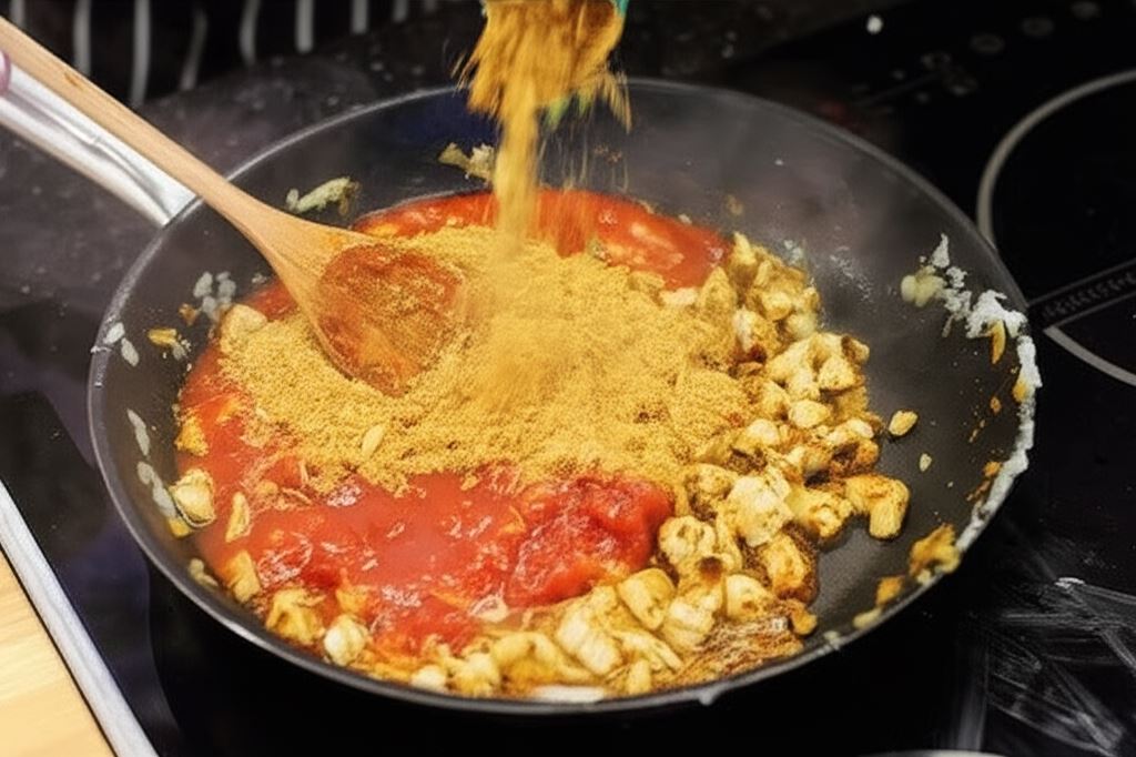 Do mięsa wsyp rozdrobnione pomidory konserwowe wraz z płynem oraz Fix Knorr. Całość zamieszaj i duś do momentu, aż sos stanie się gęstszy.