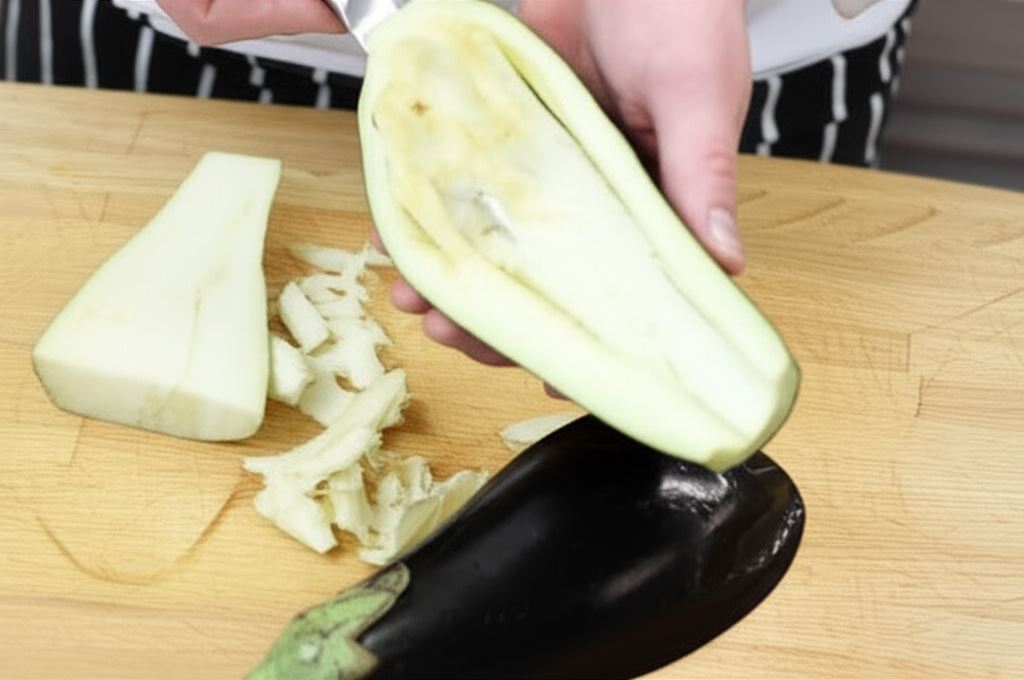 W międzyczasie dokładnie umyj bakłażana, odetnij końce i przekrój go wzdłuż na połowę. Potem wydrąż małym nożem miąższ.