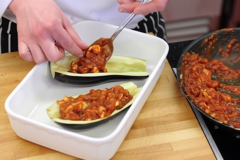 Teraz umieść w bakłażanie nadzienie z kurczaka. Całość piecz przez 15 minut w temperaturze 180 °C. Potrawa wyjątkowo dobrze komponuje się z sosem jogurtowym.