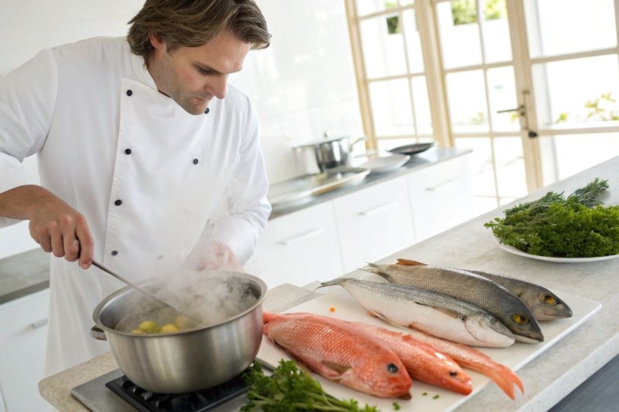 Wywar przygotowujemy gotując głowy, ości i obierki warzyw przez 30-40 minut na małym ogniu. Po przecedzeniu dodajemy pokrojone warzywa i gotujemy kolejne 15 minut. Filety rybne dodajemy na sam koniec – dorsz i sandacz wymagają zaledwie 5-7 minut gotowania, a łosoś jeszcze krócej – 3-5 minut. Zbyt długie gotowanie sprawi, że ryba stanie się rozpadająca i gumowata.
