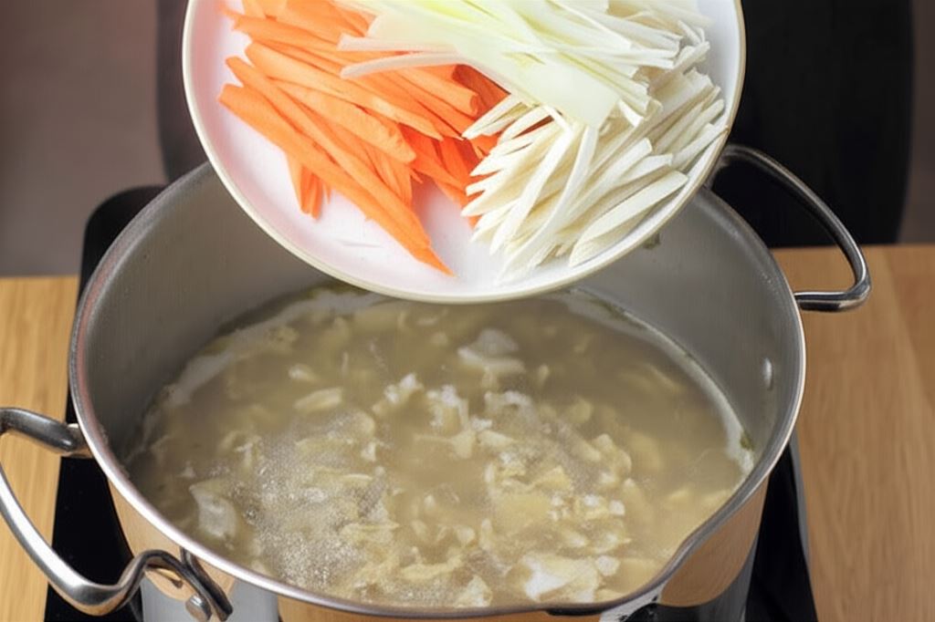 W międzyczasie obierz warzywa, pokrój je na drobne paseczki i wrzuć je do flaków około 30 minut przed zakończeniem gotowania.