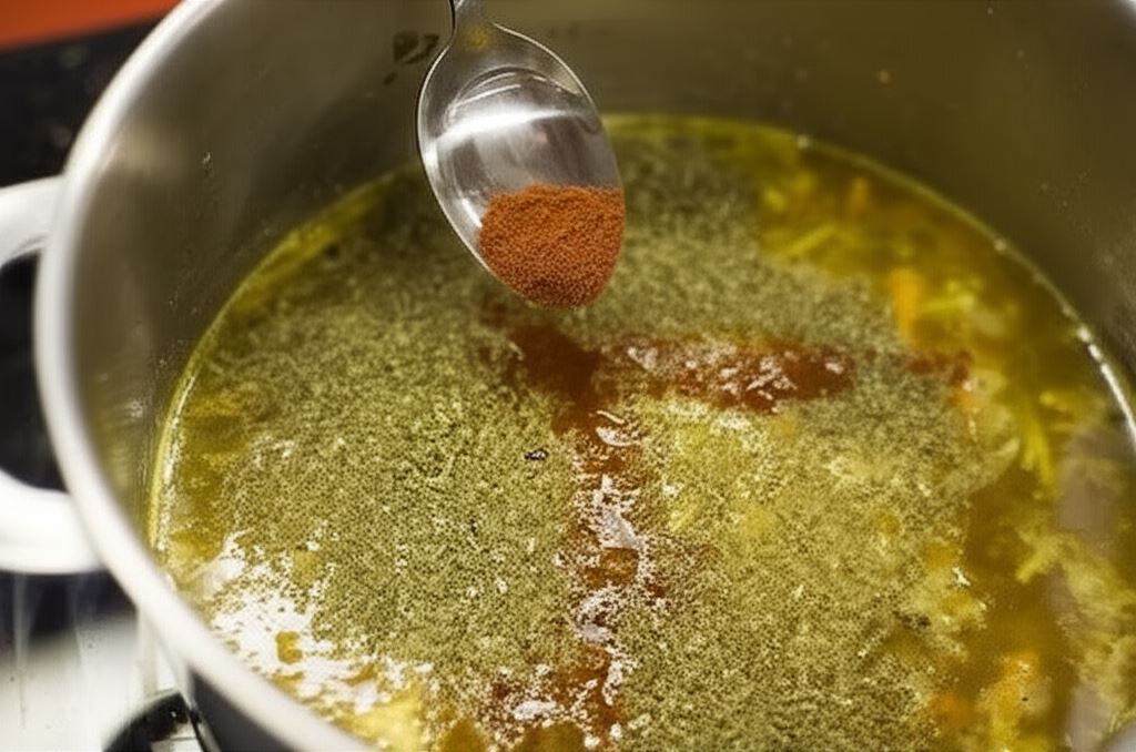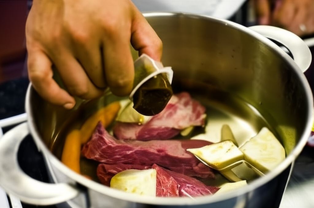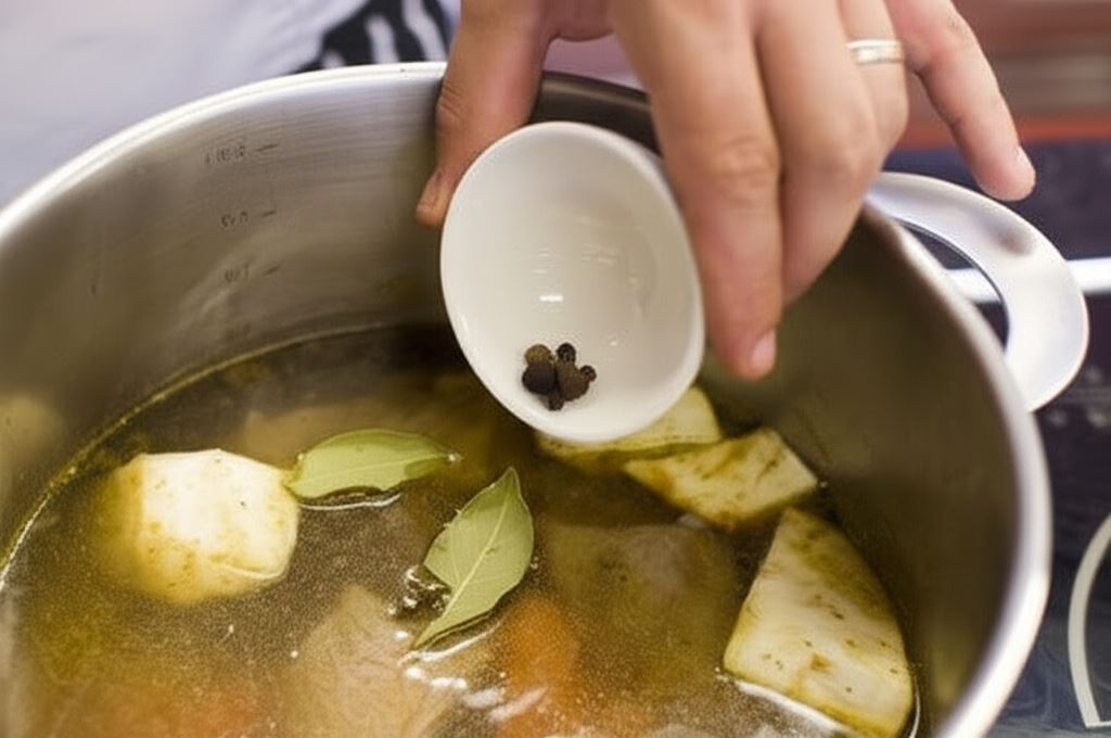 Usuń utworzoną pianę, wsyp ziarna pieprzu, ziele angielskie, dwa liście laurowe i przygotuj esencjonalny wywar.