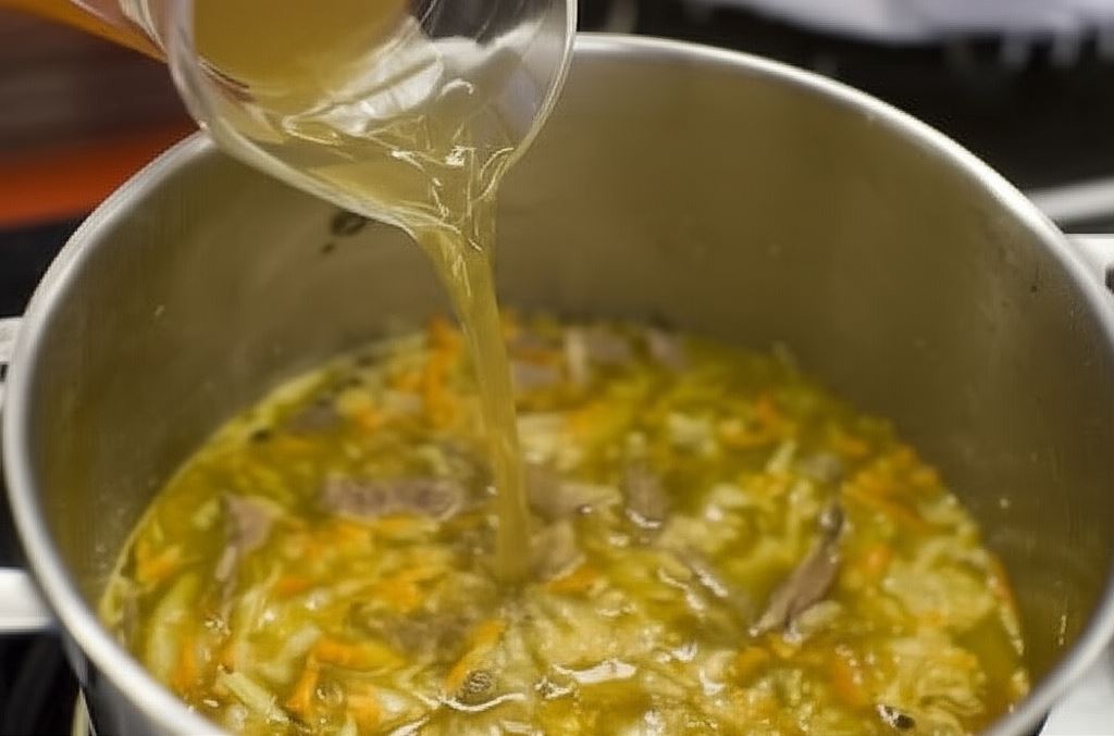 Odcedź przygotowany wywar. Mięso potnij w paski, pozostałe nieugotowane warzywa pokrój w cienkie paski lub zeszklij na tarce.