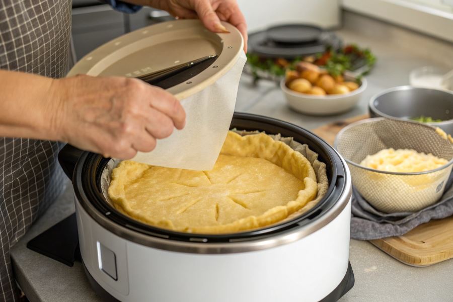 Misę multicookera wysmaruj masłem i wyłóż papierem do pieczenia, pozostawiając zapas na bokach dla łatwego wyjęcia. Schłodzone ciasto rozwałkuj i przenieś do misy, dokładnie dopasowując do dna i boków. Nakłuj widelcem, aby zapobiec pęcherzom powietrza.
