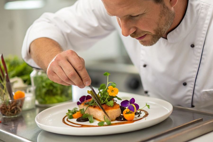 Dania rybne wymagają lekkości i świeżości. Sprawdza się tu technika warstwowa – ryba ułożona na poduszce z warzyw, zwieńczona mikrozieleniną i otoczona emulsją ziołową tworzy efekt głębi i lekkości jednocześnie.