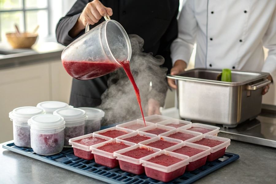 Porcjowanie w formach do lodu jest idealne, gdy potrzebujemy małych porcji barszczu do szybkiego użycia. Po zamrożeniu kostki można przełożyć do woreczka strunowego, co ułatwi przechowywanie i pozwoli na wykorzystanie dokładnie takiej ilości, jakiej potrzebujemy.