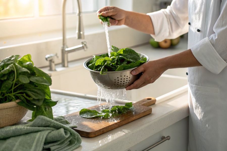Świeży szpinak wymaga dokładnego oczyszczenia przed użyciem. Najskuteczniejsza metoda to trzykrotne płukanie w zimnej wodzie, co pozwala usunąć piasek i zanieczyszczenia. Po umyciu należy dokładnie osuszyć liście za pomocą wirówki do sałaty lub ręczników papierowych. Przed dalszą obróbką warto usunąć twarde łodygi, szczególnie ze starszych liści, oraz podzielić większe liście na mniejsze części.