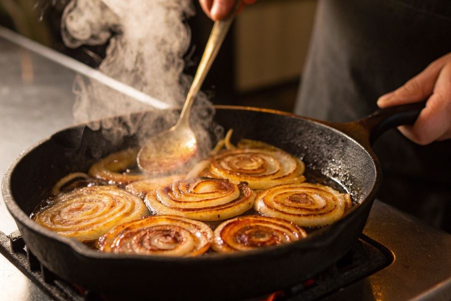 Sposób krojenia cebuli wpływa na końcowy efekt: półplasterki karmelizują się równomierniej niż kostka, a cienkie plastry szybciej się przypalają.