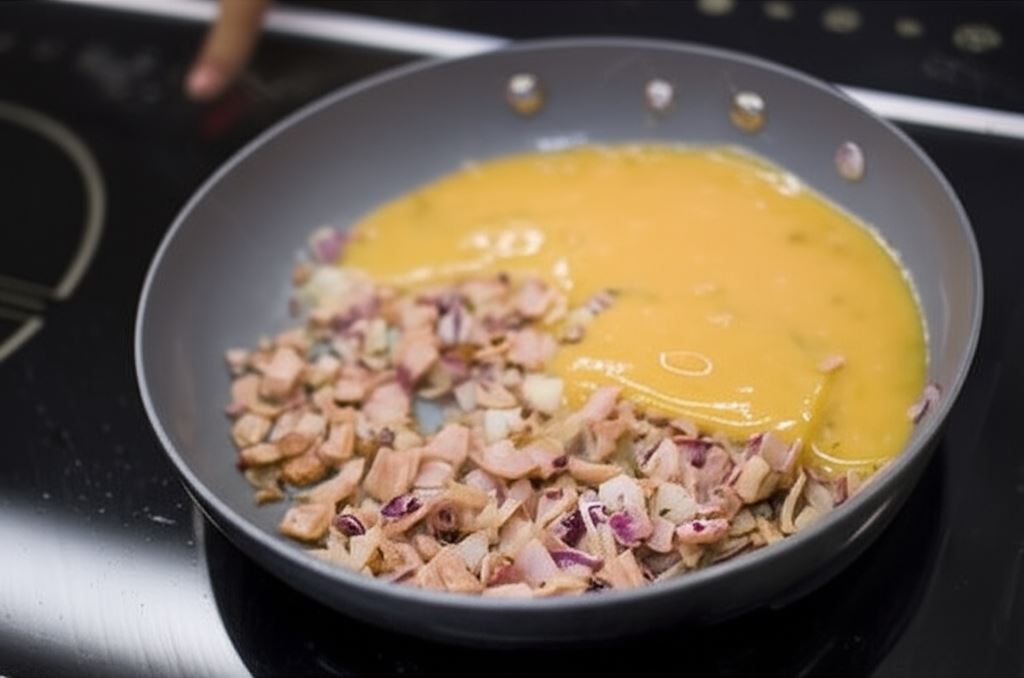 Szynkę oraz czerwoną cebulę pokrój w małą kostkę i przysmaż na patelni. Potem zalej jajkami.