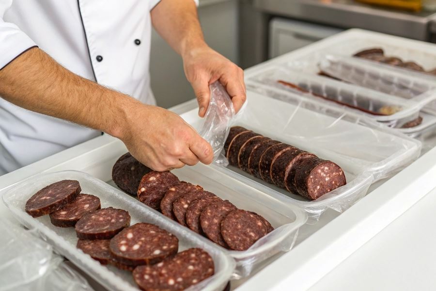 Pakowanie kaszanki przed mrożeniem ma decydujący wpływ na jej jakość po rozmrożeniu. Najskuteczniejszą metodą jest wykorzystanie woreczków próżniowych, które całkowicie eliminują kontakt z powietrzem. Alternatywnie można użyć folii spożywczej, dokładnie owijając każdą porcję, a następnie umieszczając w szczelnym pojemniku lub woreczku strunowym. Przed zamknięciem opakowania należy maksymalnie usunąć powietrze – można to zrobić zanurzając częściowo zamknięty woreczek w wodzie lub używając słomki do odessania nadmiaru powietrza.