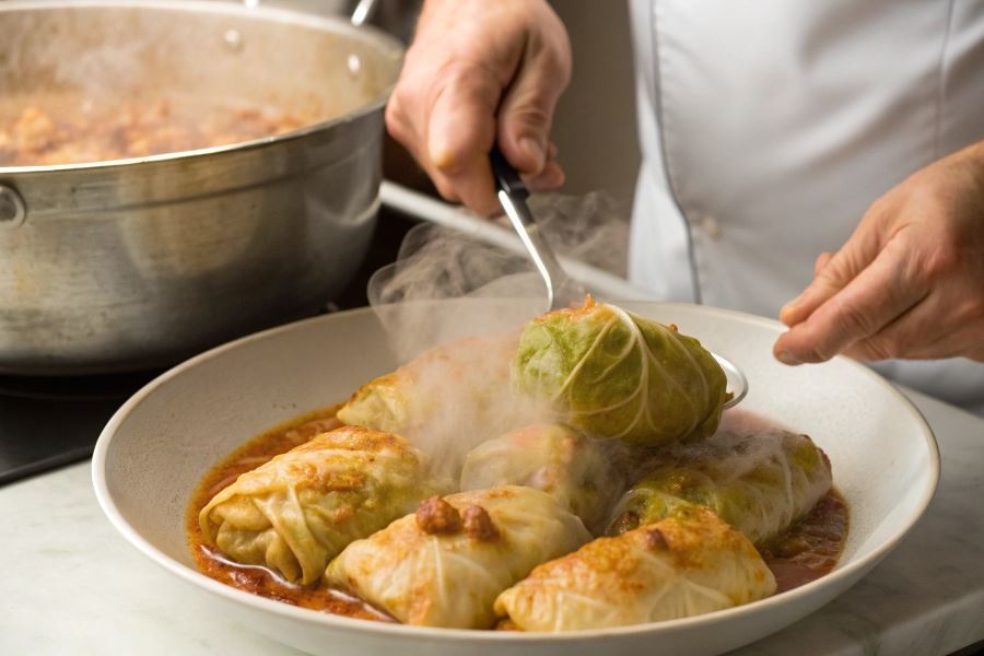 Dekorując talerz, postaw na kontrasty kolorystyczne – czerwony sos pomidorowy, zielone zioła i biała śmietana tworzą apetyczny wygląd. Na rodzinny obiad podawaj gołąbki w głębokim naczyniu z sosem, a na przyjęcia – pojedynczo na talerzach z artystycznie ułożonymi dodatkami i kleksem gęstej śmietany.