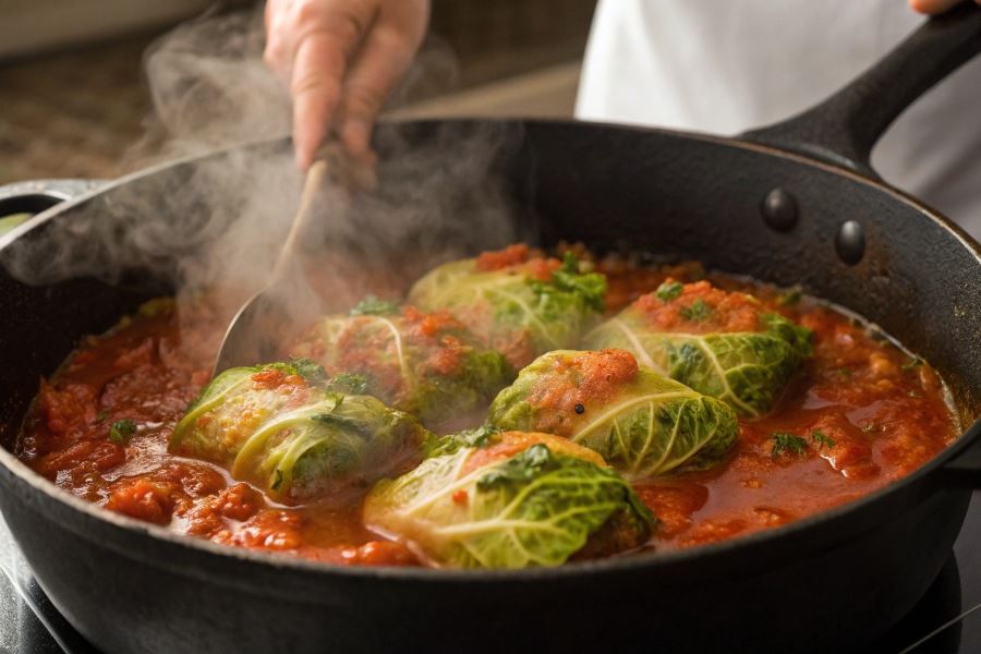 Kluczem do sukcesu jest utrzymanie niskiej temperatury – gołąbki powinny delikatnie „mrugać” pod przykryciem, a nie intensywnie się gotować. Zbyt wysoka temperatura spowoduje rozpadanie się kapusty i wysuszenie farszu.