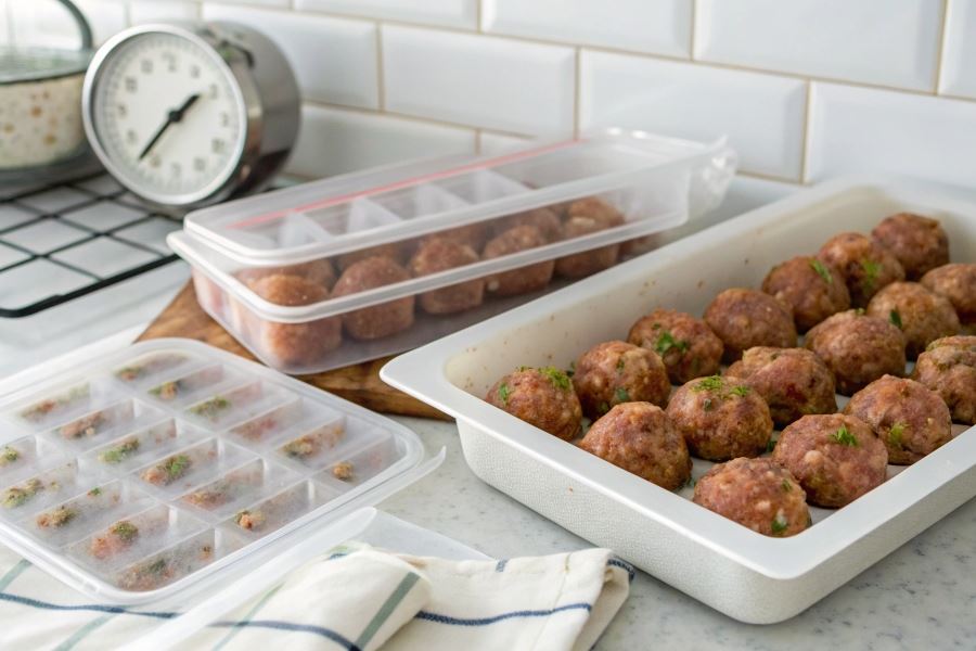 Po wstępnej obróbce klopsiki należy ostudzić do temperatury pokojowej, a następnie zamrozić wstępnie na blasze przez 2 godziny. Dzięki temu nie skleją się podczas długotrwałego przechowywania.