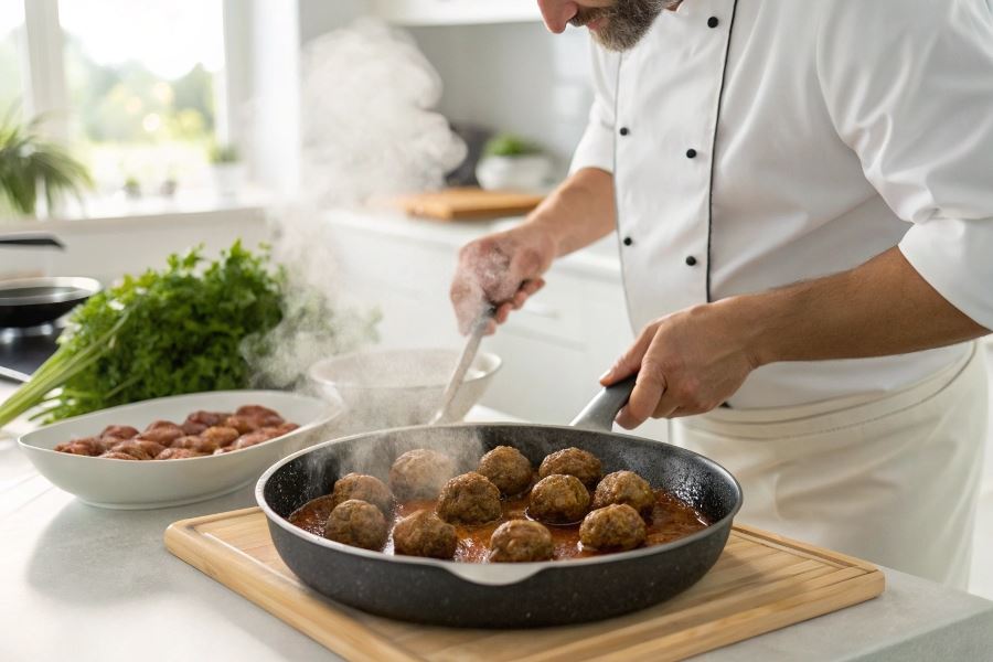 Smażenie na patelni wymaga nieco więcej uwagi, ale daje znakomite rezultaty. Rozgrzej patelnię z 2-3 łyżkami oleju i smaż pulpety na średnim ogniu przez około 10-15 minut, regularnie obracając. Dla lepszego efektu: