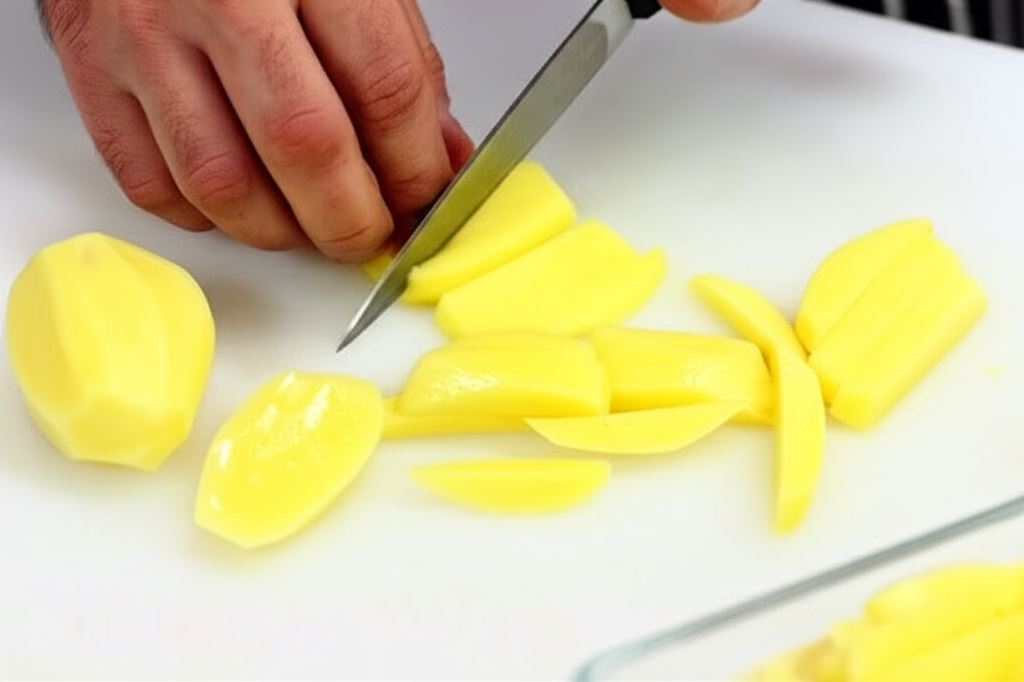 Obierz ziemniaki i pokrój je w słupki wedle preferencji.