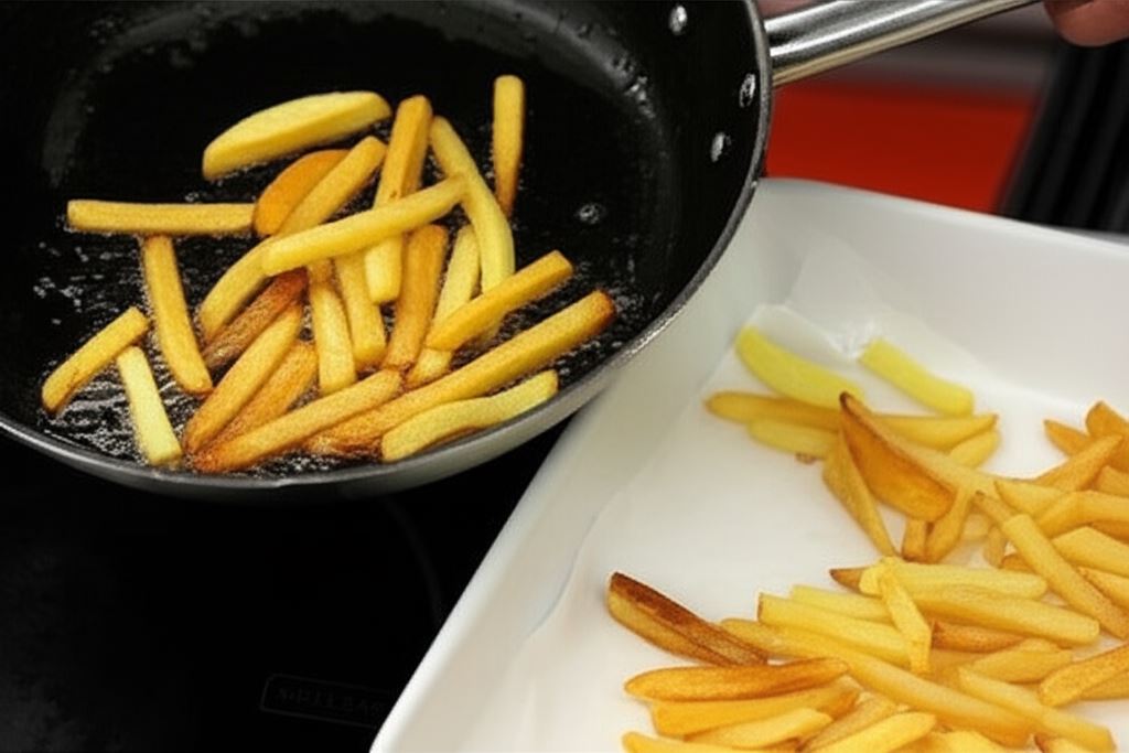 Rozgrzej olej na patelni i smaż frytki aż uzyskają złocisty kolor, a następnie odsącz je na papierowym ręczniku z nadmiaru tłuszczu.