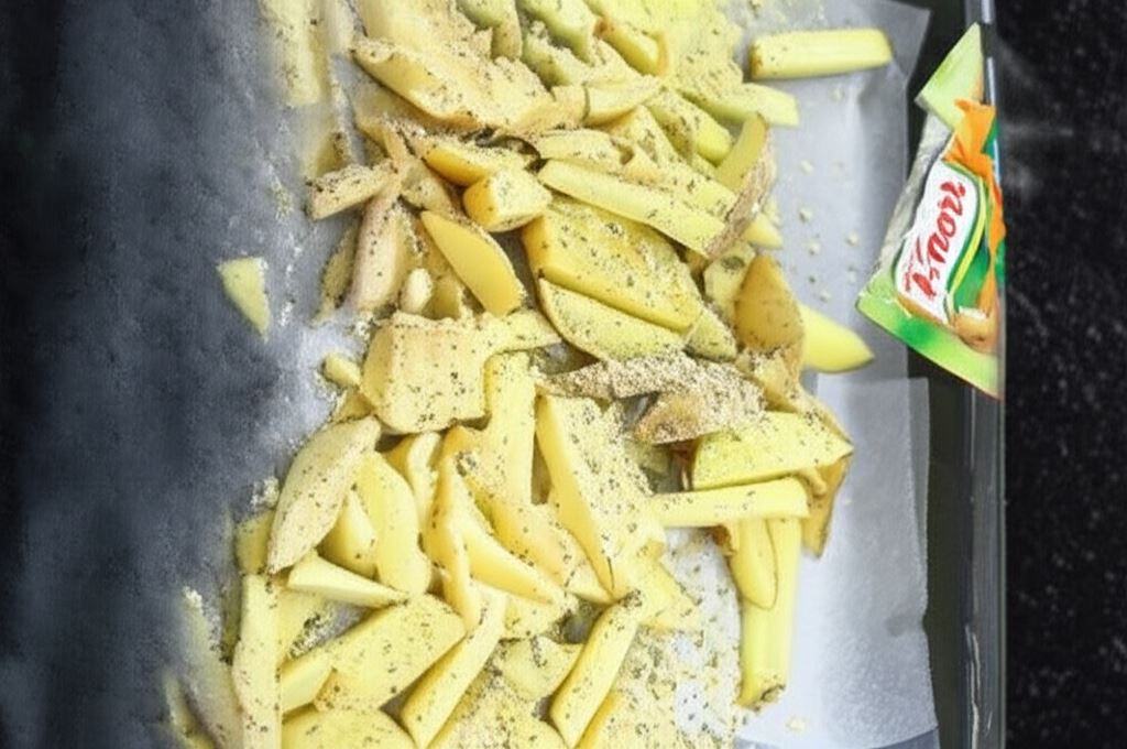 Frytki umieść na płaskiej blaszce do piekarnika wyłożonej papierem do pieczenia. Polej olejem i posyp przyprawą włoską Knorr o grubym przemiałe. Piecz przez 45 minut, aż staną się chrupiące i zrumienione.