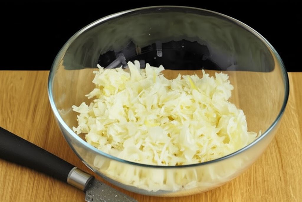 Kapustę wyciśnij z nadmiaru płynu i drobno posiekaj.