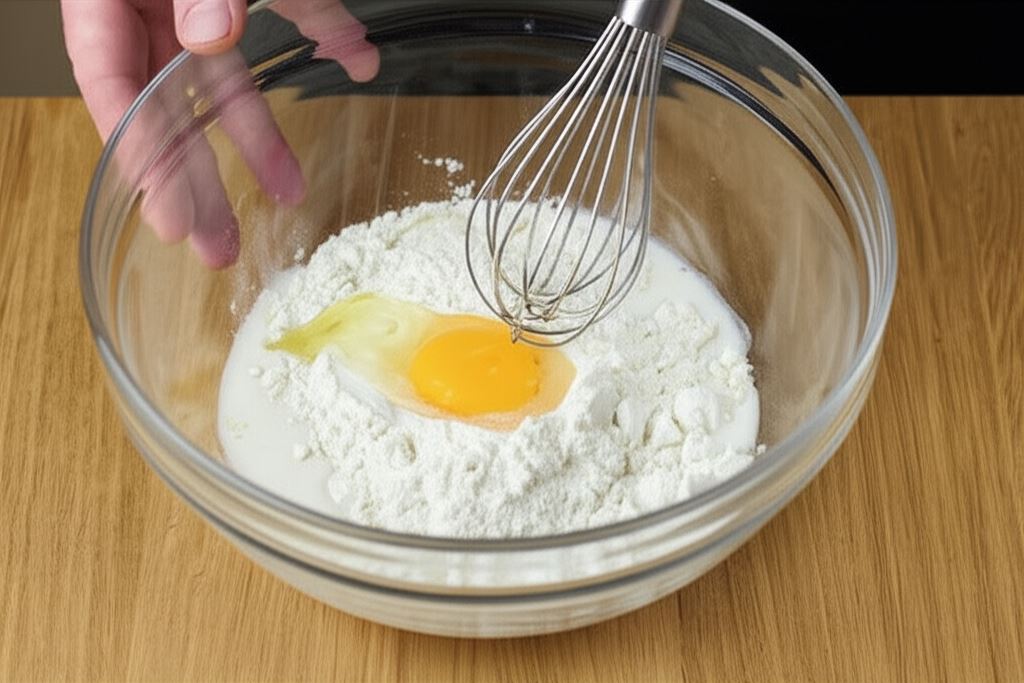 W dużej misce dokładnie wymieszaj mleko, jajko, mąkę i sól.