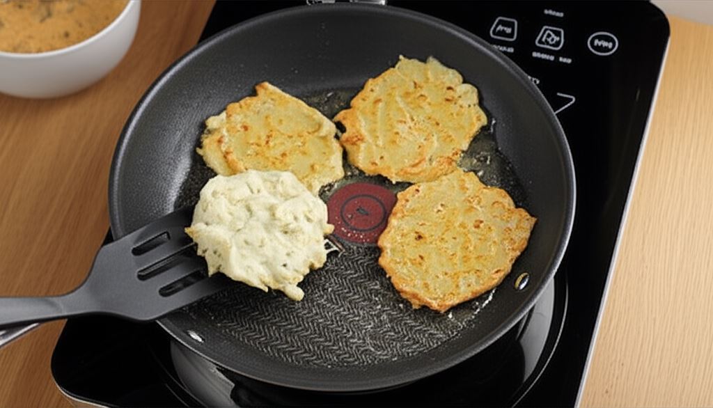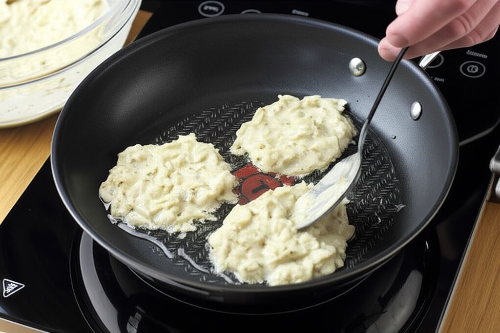 Rozgrzej na patelni odrobinę oleju i używając łyżki formuj z ciasta małe placuszki.