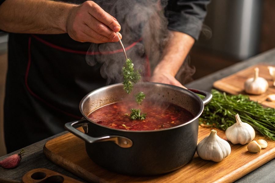 Czosnek dodany w ostatnich 5-10 minutach gotowania zachowuje swoją pikantność i wyrazistość, nadając barszczowi charakterystyczny, ostrzejszy finisz.