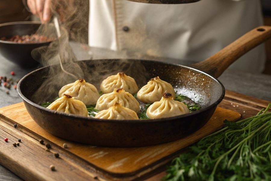 2. Etap drugi: dosmażanie pod przykryciem – po zarumienieniu spodu, dodaj 2-3 łyżki wody do patelni, natychmiast przykryj pokrywką i zmniejsz ogień. Pozwól chinkali gotować się w powstałej parze przez 5-7 minut, aż ciasto będzie miękkie, a nadzienie w pełni ugotowane.