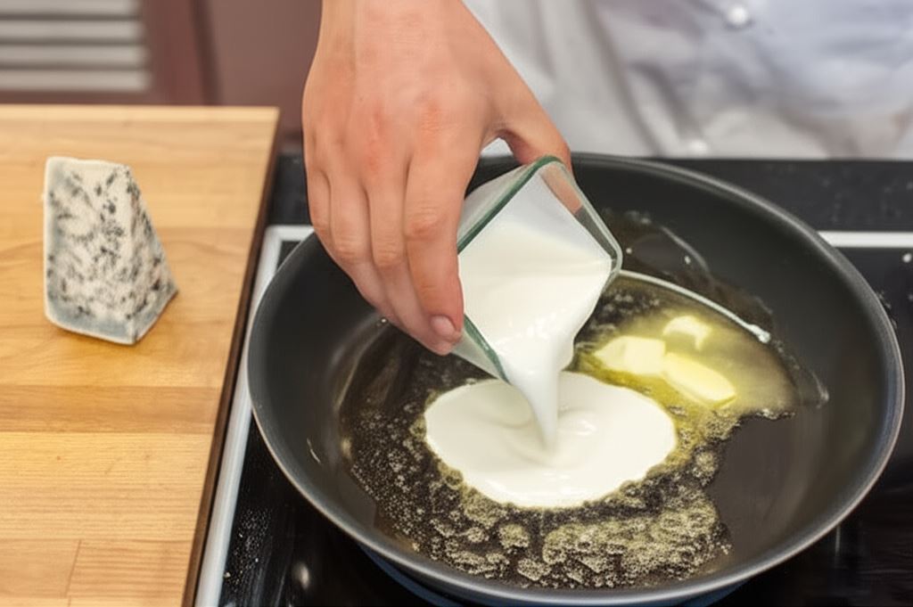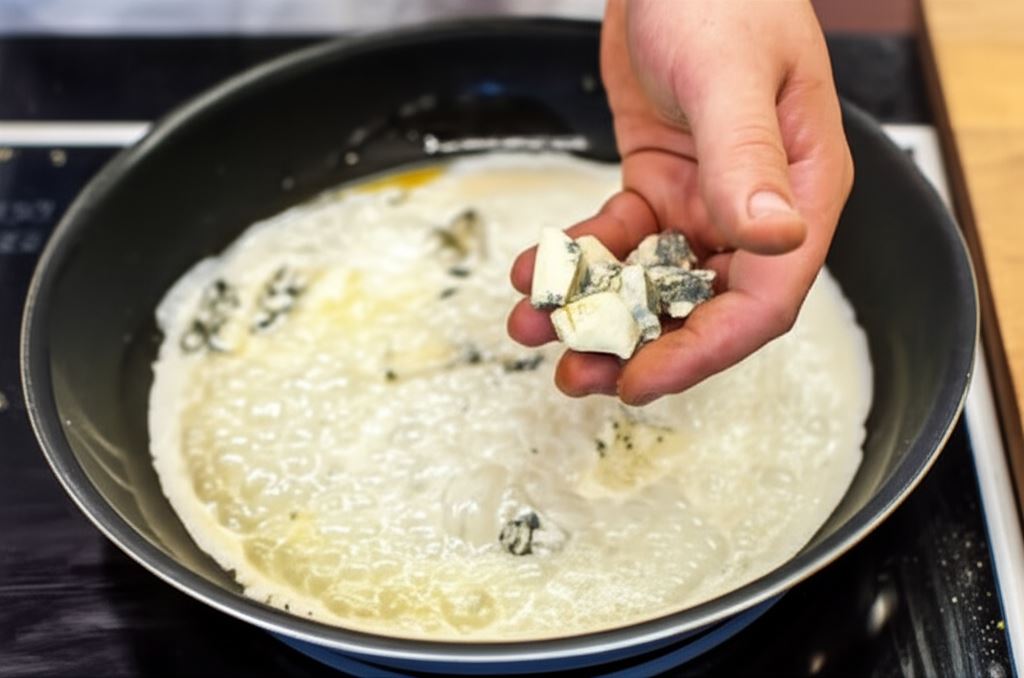 Kiedy sos stanie się jednolity, wsyp pokruszoną gorgonzolę. Zaczekaj, aż ser się roztopi.