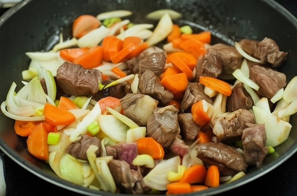 Na rozgrzanym tłuszczu obsmażaj mięso pokrojone w grubą kostkę. Wsyp cebulę pokrojoną w piórka, seler pokrojony w kostkę oraz marchewkę pokrojoną w półplastry.
