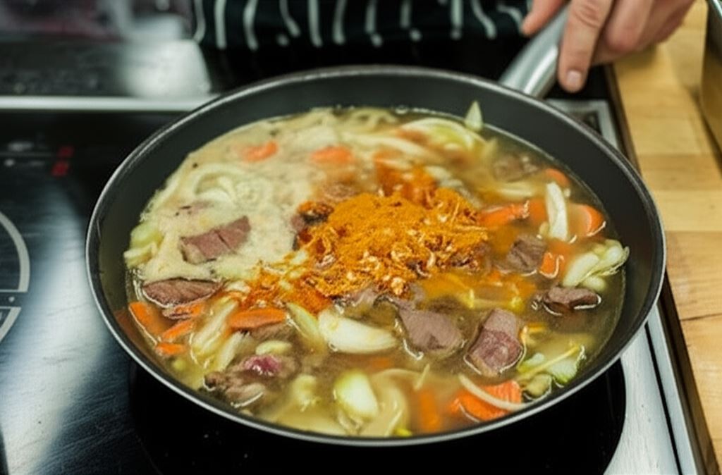 Zalej wszystko 500 ml wody i wsyp Knorr Naturalnie smaczne. Gotuj całość przez około 40 minut, dopóki sos nie zgęstnieje a mięso stanie się miękkie.