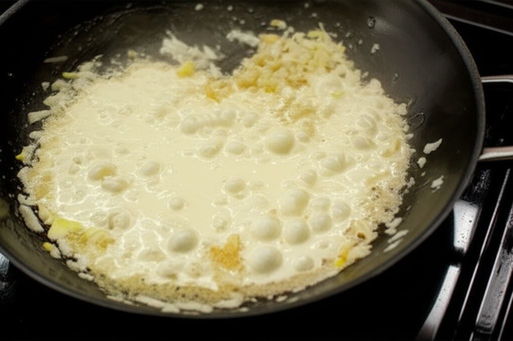 Podsmaż na patelni szalotkę i czosnek, wlej śmietankę, przypraw do smaku solą i pieprzem.