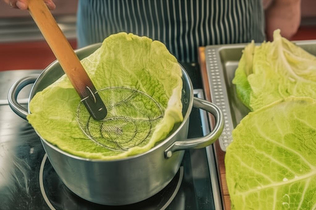 Kapustę oczyść z liści i zblanszuj je w gotującej wodzie.