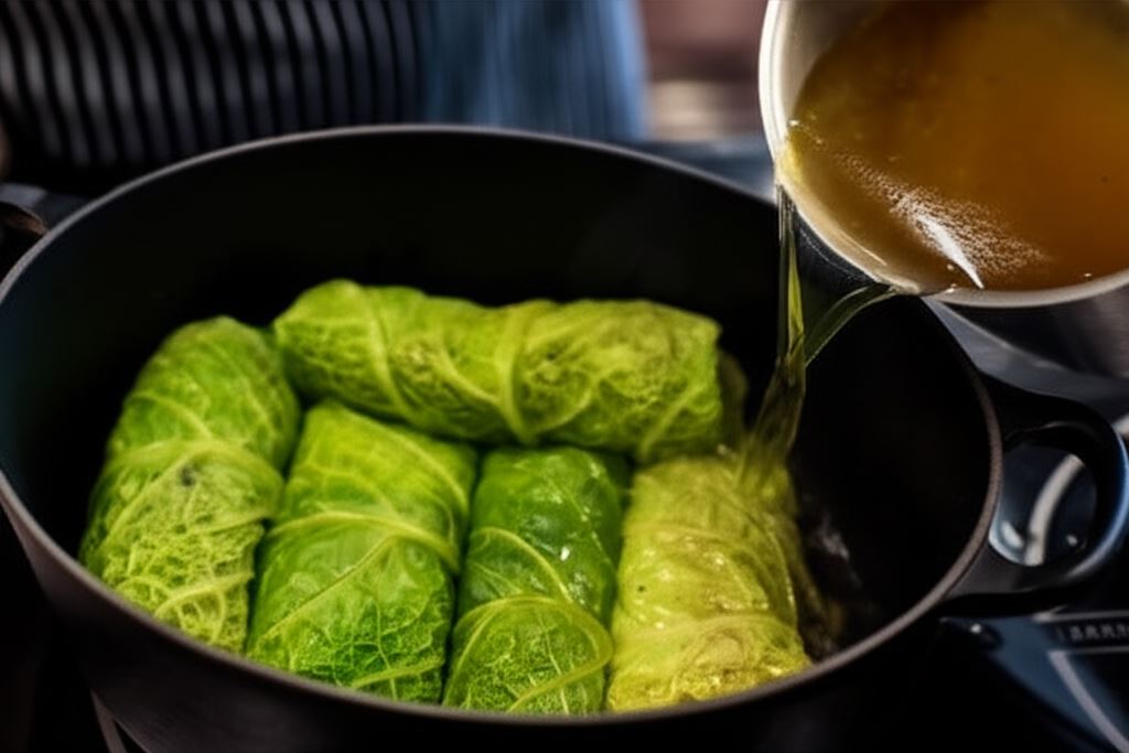 Przygotowane gołąbki umieść w głębokim garnku, zalej bulionem i duś przez 20 minut na małym ogniu.