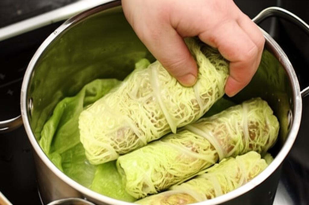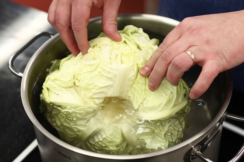 Usuń głąb z kapusty, nacinając jednocześnie połączenie liści. Włóż całą główkę kapusty do wrzącej wody. Utrzymuj wodę w temperaturze około 90°C, aby nie wrzała zbyt mocno. Obparzone liście zdejmuj kolejno z główki i odkładaj na bok.
