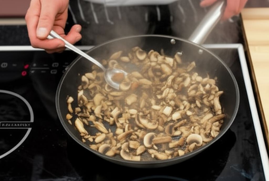 Pieczarki drobno posiekaj i smaż na rozgrzanej patelni z margaryną oraz rozdrobnioną kostką Knorr, aż staną się miękkie.