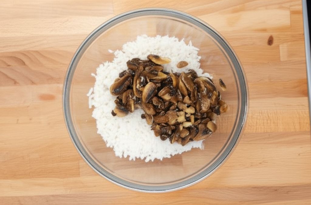 Odłóż dwie łyżki pieczarek, a pozostałą część połącz z ryżem.