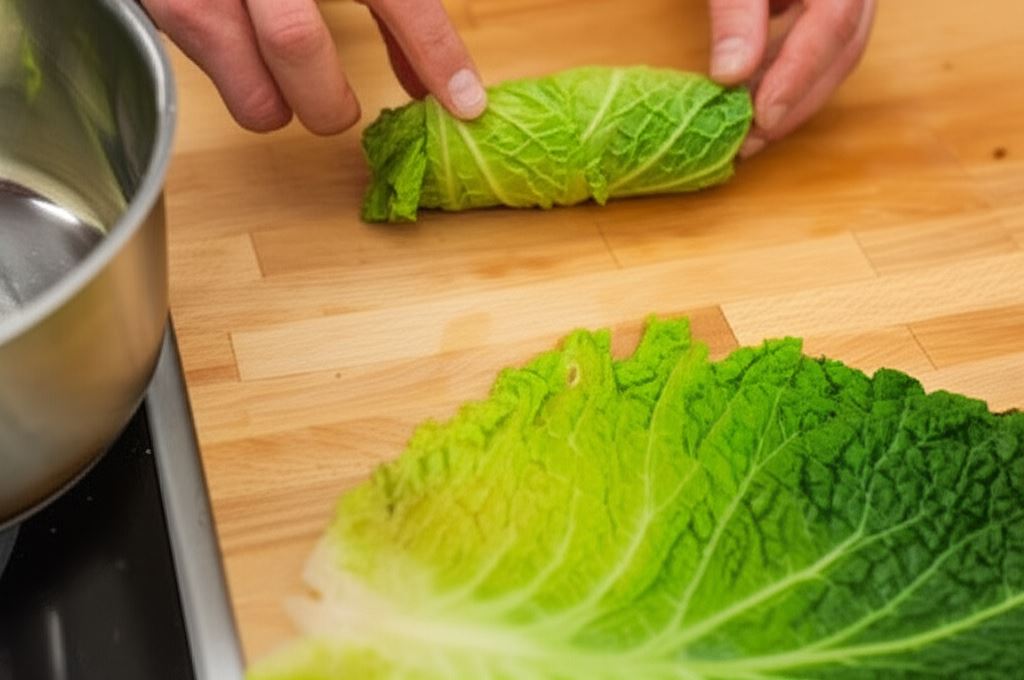 Wytnij środek z kapusty i gotuj w wodzie, zdejmując kolejno górne ugotowane liście. Z liści odetnij grube części.