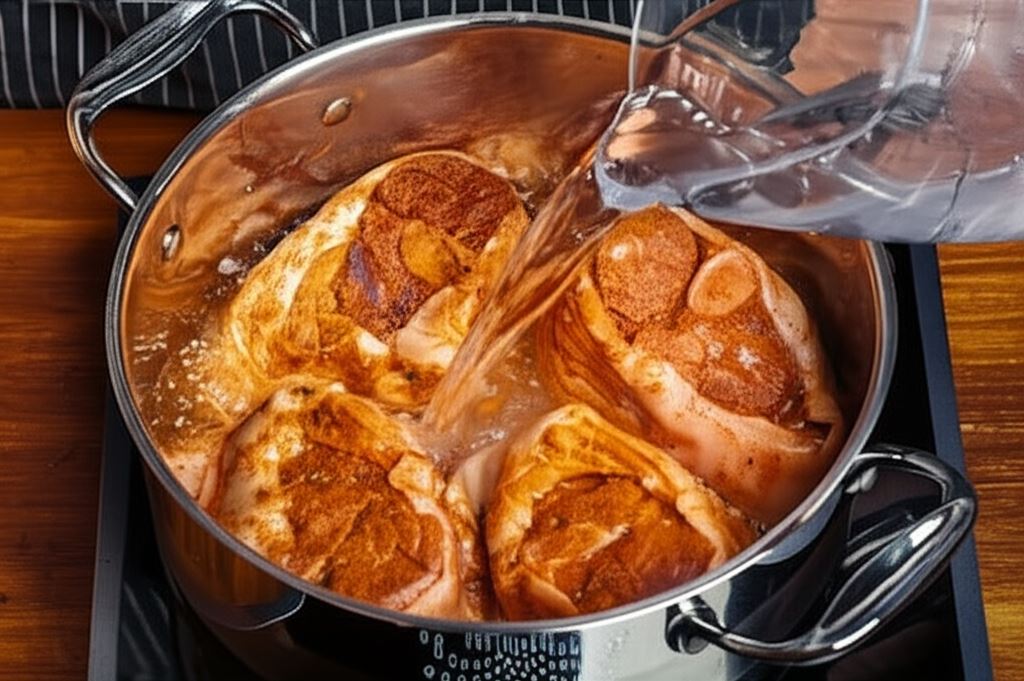 Zalej wszystko gorącą wodą, dodaj liść laurowy, pieprz i ziele angielskie. Gotuj około 1.5h.