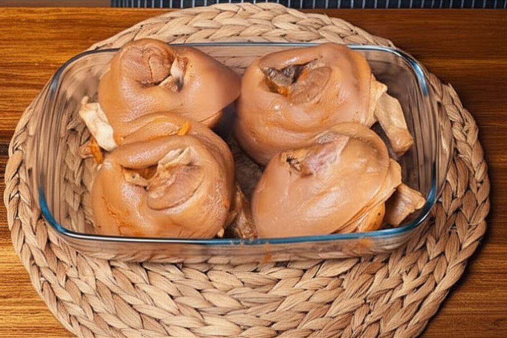 Po ugotowaniu odcedź golonki (wywar zachowaj) i umieść w naczyniu żaroodpornym. Włóż do rozgrzanego do 180°C piekarnika i piecz przez około godzinę.
